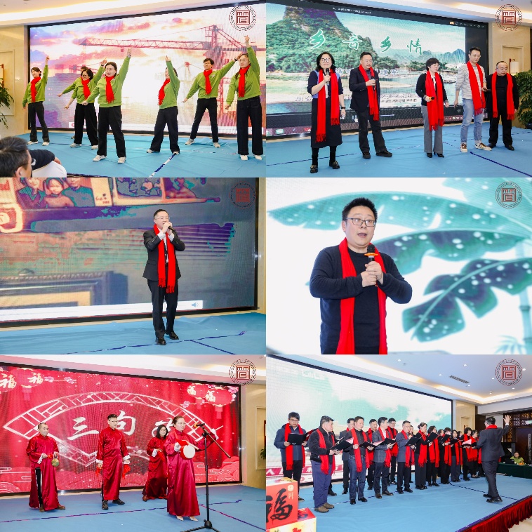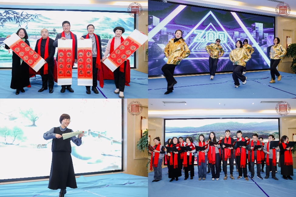 文艺表演环节由李丽红、王一成、吕晓慧、李浩清四位老师联袂主持。开场舞《我相信》节奏明快、活力四射,七位老师以整齐舞步与灿烂笑容点燃全场;许凯渤老师的独唱《人世间》嗓音温暖,深情动人;李丽红、李慧凤等四位老师带来的三句半《敲锣打鼓话新年》幽默欢快,年味十足。袁冬梅、陈忠等领导班子联袂演绎的歌曲联唱《乡音乡情》《一路生花》,歌声婉转,寄托美好愿景,送上对管院全体教师的专属祝福;朱光磊老师以唐调吟诵《水调歌头·明月几时有》,复以昆腔吟唱《渔歌子》,声韵古朴,意境悠远。教职工合唱《我和我的祖国》情感饱满,气势恢宏;周义程、桑明旭等老师呈现的《书法与葫芦丝表演》,笔墨挥洒与丝音袅袅相映成趣,尽显“书乐和鸣”之雅。舞蹈串烧《故乡情》&《ZOO》巧妙融合了民族风韵与现代节奏,展现了学院教师的多彩才艺。最后,二十余位教师共同唱响《明天会更好》,为整场演出画上圆满句号。